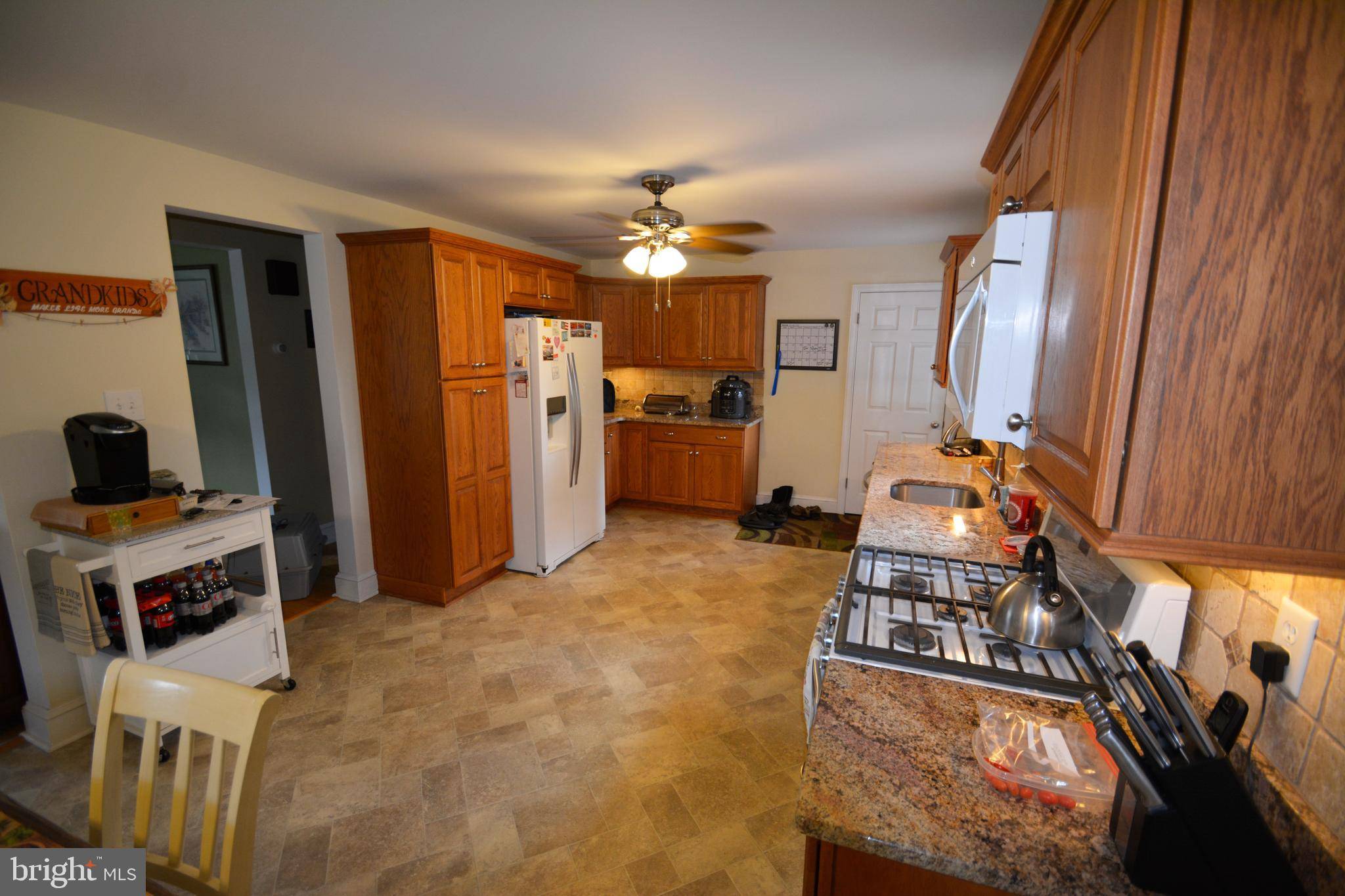 First floor features: renovated kitchen with granite; open concept kitchen/dining/family room; 3 bedrooms; 1 full renovated bath; pellet stove; and, ceiling fans in all rooms. Basement features: full bath, full kitchen, outside stair access with Bilco doors, laundry area, and separate storage room.